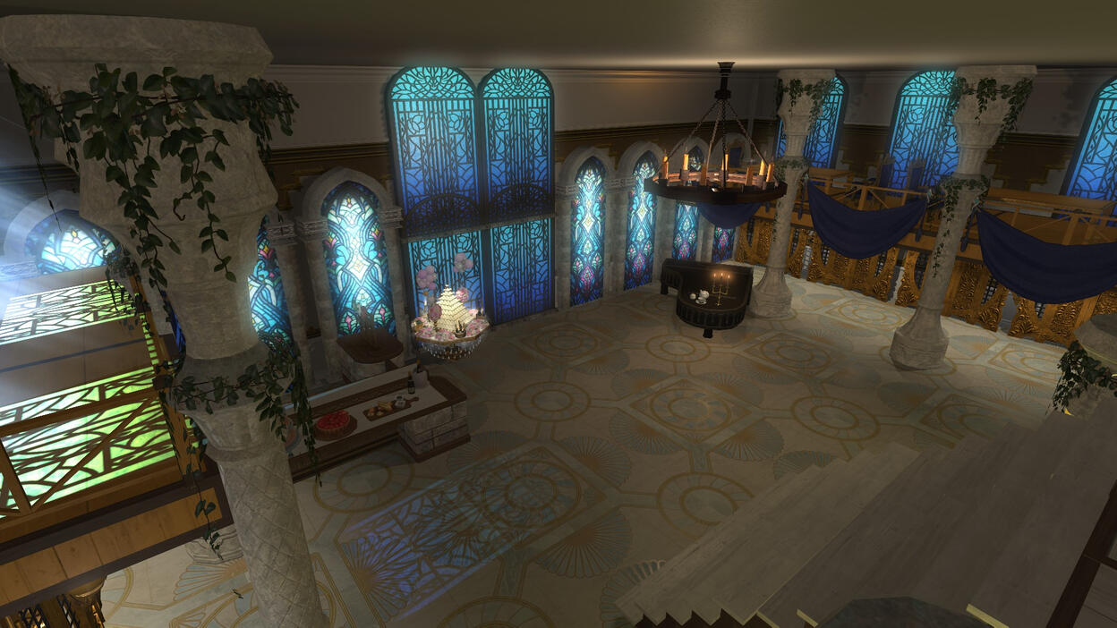 The ballroom is outfitted with a DJ booth, a servery corner and three tables for casual conversation and food. The stained glass and floor-to-ceiling moonlit doors accentuate against the marble flooring, creating the perfect atmosphere for a ballroom space and a venue for your next reception or party.Rental Cost: 500,000 gil per dayPlease note that colours of banners can be adjusted accordingly, but the overall set-up cannot change.To book your event, please submit a form on Discord.